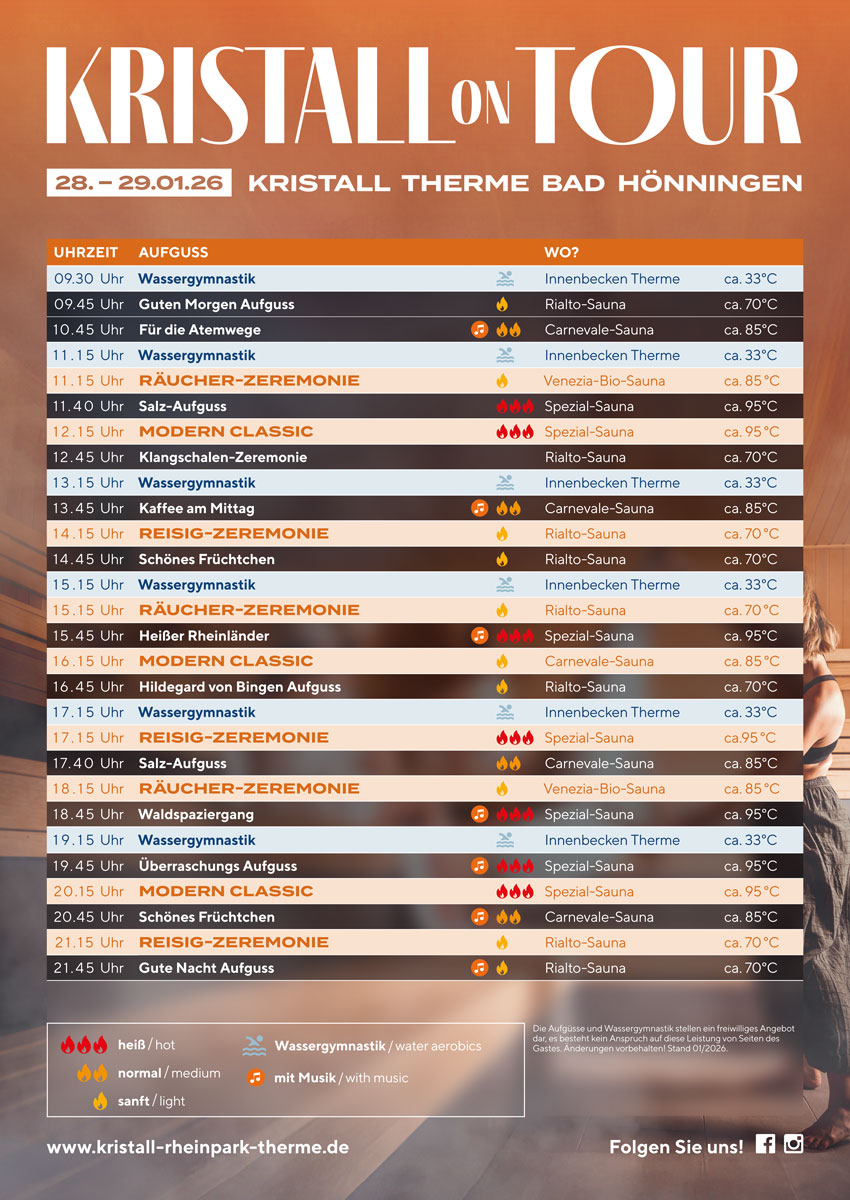 Home Öffnungszeiten Kontakt Download Sauna Erlebnis-Fahrplan Einfach Ihren Wunsch-Aufguss wählen Download Kristall on Tour Erlebnis-Fahrplan Download Sauna-Erlebnis-Fahrplan